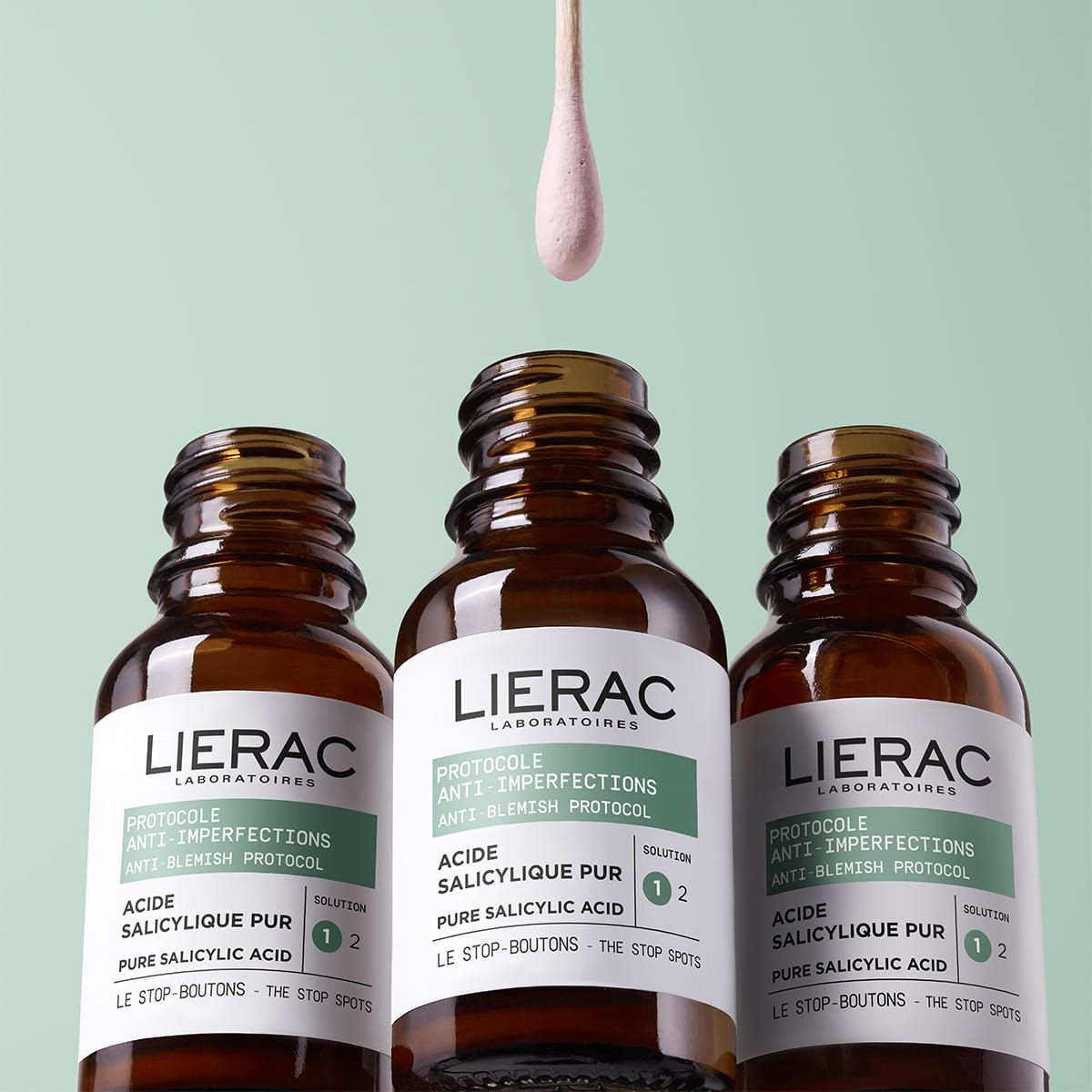 Apply in the evening. Do not shake. Dip a cotton bud into the bottle to reach the powder, then apply to targeted blemishes. Avoid the eye contour area. For a complete protocol, use in addition to the ② Long-term solution: The Peeling.